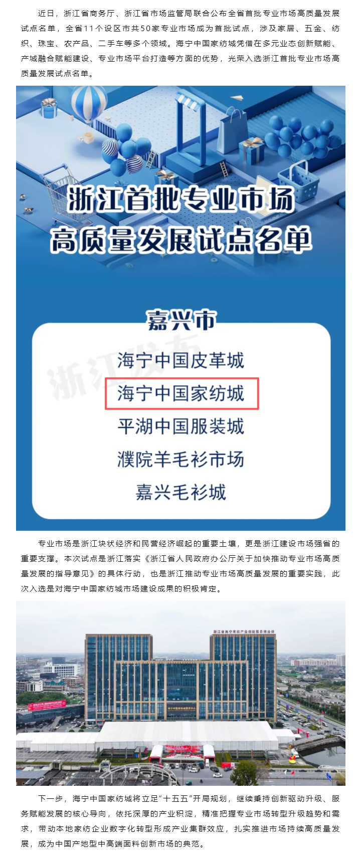喜报丨海宁中国家纺城入选浙江首批专业市场高质量发展试点名单